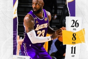 赛后,湖人官方发布詹姆斯本场26+8+11数据海报。